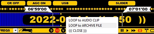 In the example below, a LOOP covering two minutes around the TOH has been created and TOOLBAR > SCISSORS has been clicked. A popup menu appears and, after you click "LOOP to ARCHIVE FILE", JAGUAR will create a new archive file in the same day folder as the original file. The new file includes all the frequencies between 06:59 and 07:01. The original file remains intact.
