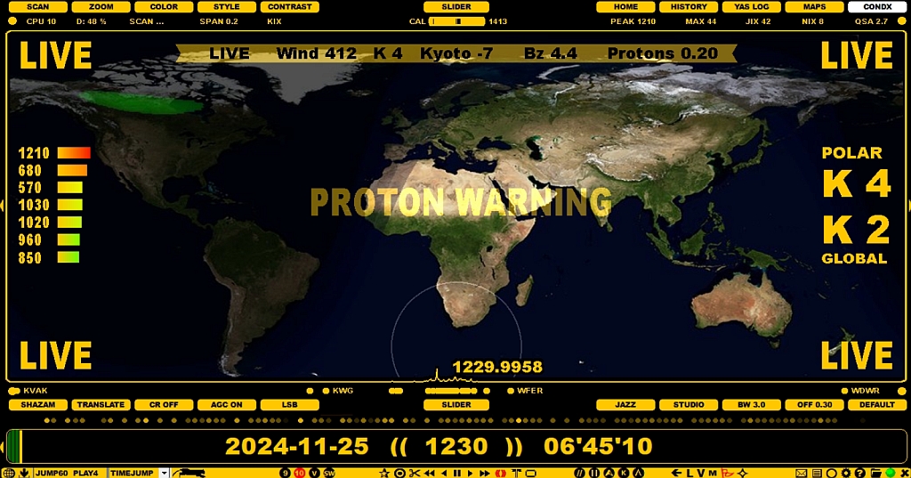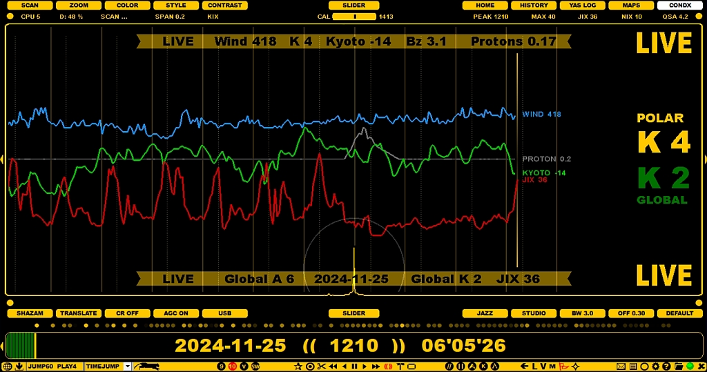 JAGUAR is more than well connected to the current and historical online space weather data ("SPACE WX"). The main space weather display is CONDX, which is the fifth JAGUAR main display. This CONDX display has two modes: LIVE MAP and history GRAPHS.