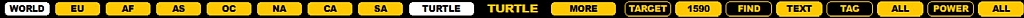 The leftmost continent button ("WORLD") can be used to combine several continents into one "DX TARGET AREA" in the output: clicking WORLD (or scrolling over the WORLD button) rotates the available DX areas: either WORLD > EMEA > EAST (if your kHz stepping is 9 kHz) or WORLD > NAMEX > CASA (if your kHz stepping 1s 10 kHz). EMEA consists of Europe, Africa and Asia up to 62 degrees Eastern latitude (covering Iran etc.), EAST covers the rest of Asia. NAMEX covers the North America and Mexico, CASA covers the rest of the Americas.