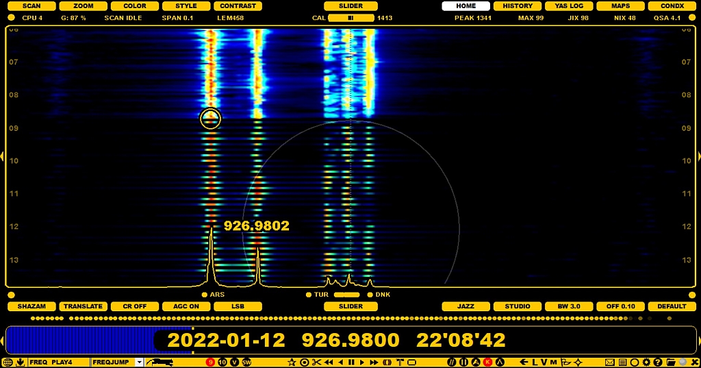 The HOME screen shows the spectrum of the currently-active frequency in the waterfall mode. The time span of the display covers the time period available in the recording. Note that, in the LIVE mode, there is always an active 10-minute playback buffer file (8 minutes if SAMPLING rate of 2000 is used). A small white circle ("runspot") shows the location in the currently-playing file. You can left-click the mouse to jump into any time point / offset within that file.