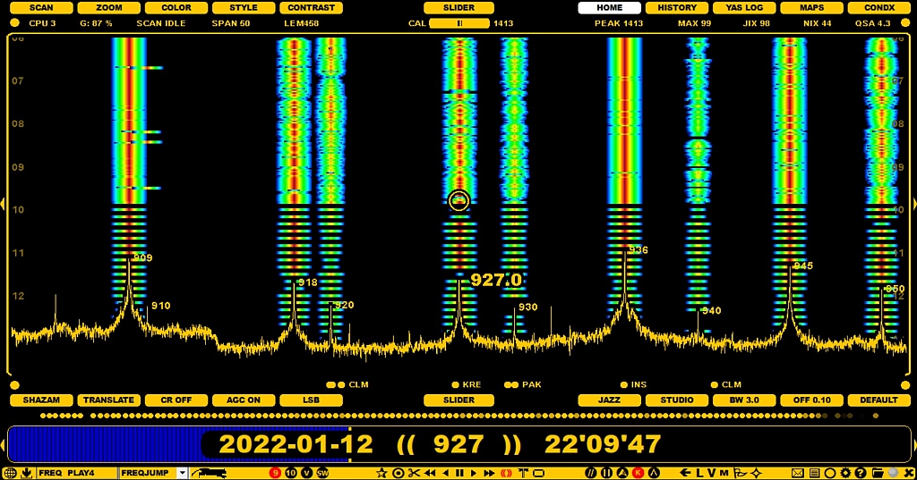The HOME (and HISTORY) spectrum can be customized via the SLIDER buttons (ZOOM, STYLE, CONTRAST - the changed values are kept only during the current session). JAGUAR PRO users can change the defaults permanently via SETTINGS > SPECTRUM (default ZOOM / CONTRAST / STYLE) and SETTINGS > PLAYBACK (default HOMESCAN stepping).