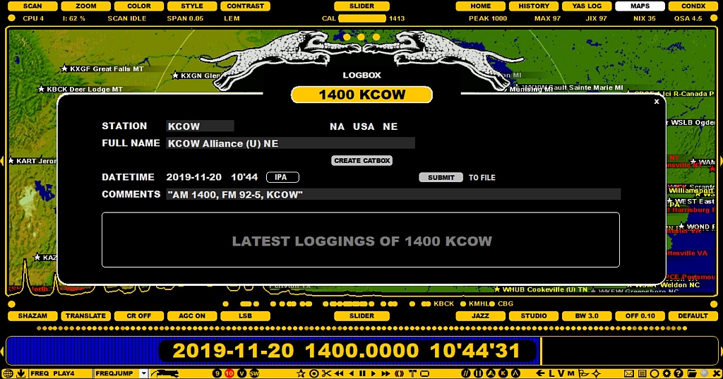 If you just want to quickly change the color of a station on MAPS / TURTLE (for example, to set the "heard" status for it on MAPS and TURTLE), you do not need LOGBOX; JAGUAR offers a special way of changing the color with "tagging". STATION MENU (see STATION MENU for details) contains a TAGGER function. When it is activated, you can change the color of many stations on the selected frequency just by clicking them on a map or TURTLE one by one. The color of the stations on MAPS is controlled by P-TAGS (see P-TAGS for details).