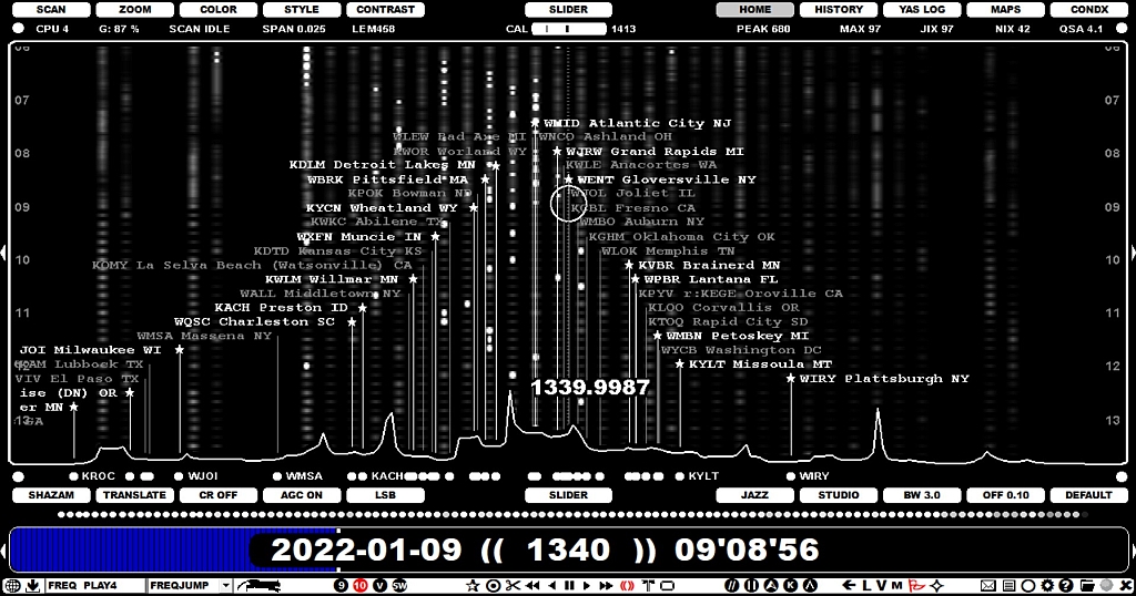 In addition to the FLAGS, public offsets are also displayed as "offset balls" below the SPECTOR curve. These dots are always visible but due to large numbers of offsets many of them are overlapping and all the names can't be shown. By default the positions are based on the MWLI offsets, but if you have FLAGS open, also the Kapsi offsets are included. Clicking any of the balls tunes the playback to that exact offset and right clicking the ball triggers the STATION MENU.