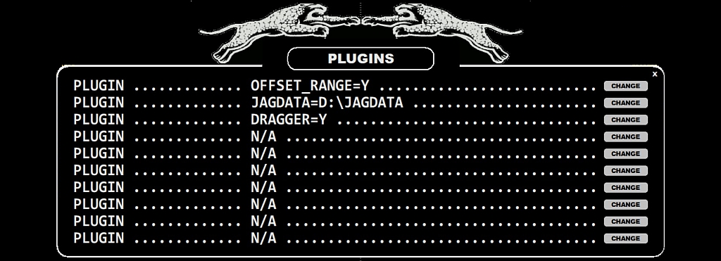 When the PLUGINS window is open, a new plugin can be added by clicking the "CHANGE" button on the right, typing the PLUGIN definition into the corresponding text box, and then clicking "SAVE". For example, the PLUGIN window can look like this: