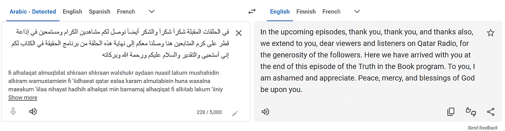 If the process is successful, your default browser will be triggered with the direct jump to the Google translator. If you are lucky, you may get some vital information for your potential reception report - or you may get a hilarious moment when seeing that you yourself are still much smarter than the machine - often these both can happen in the same transcription/translation. Below you'll find an example of the translation for an Arabic speaking radio station.
