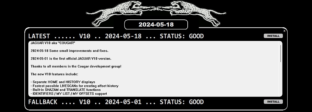 The VERSION window shows the latest news about JAGUAR's development and versions, for example