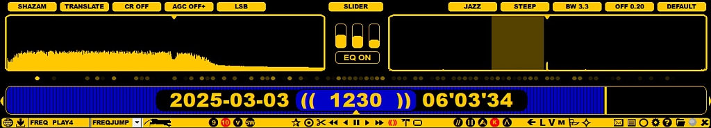 The AUDIO WINDOW can be used for finetuning the audio output: tuning the filter offset and size, using the equalizer and tuning automatic notches and adding/tuning manual notches. You can see the effect of any change made in the audio frequency spectrum shown left in the window.