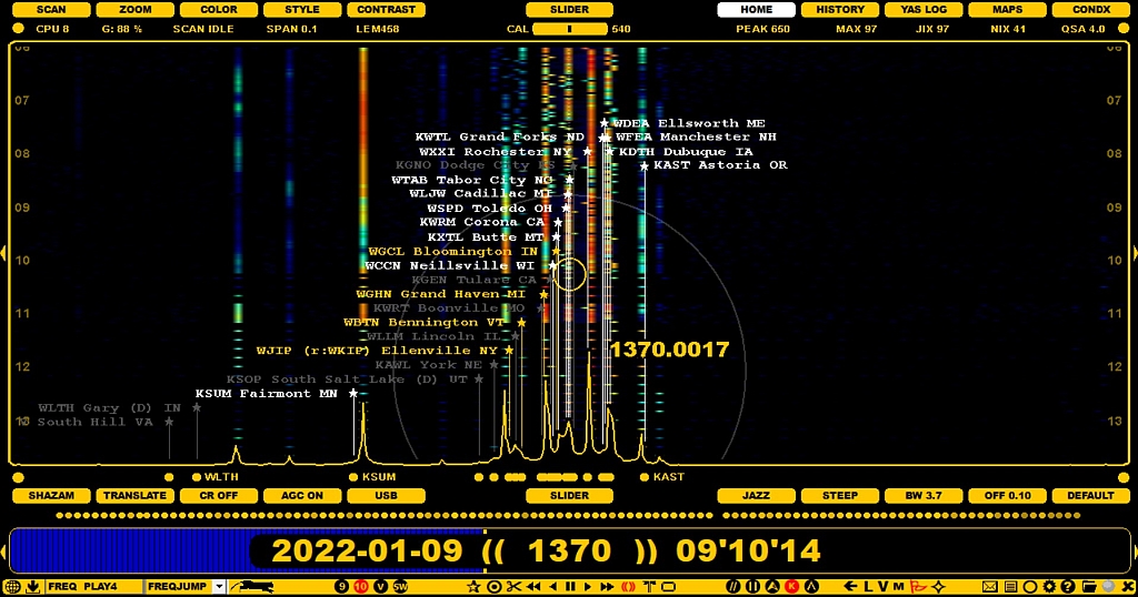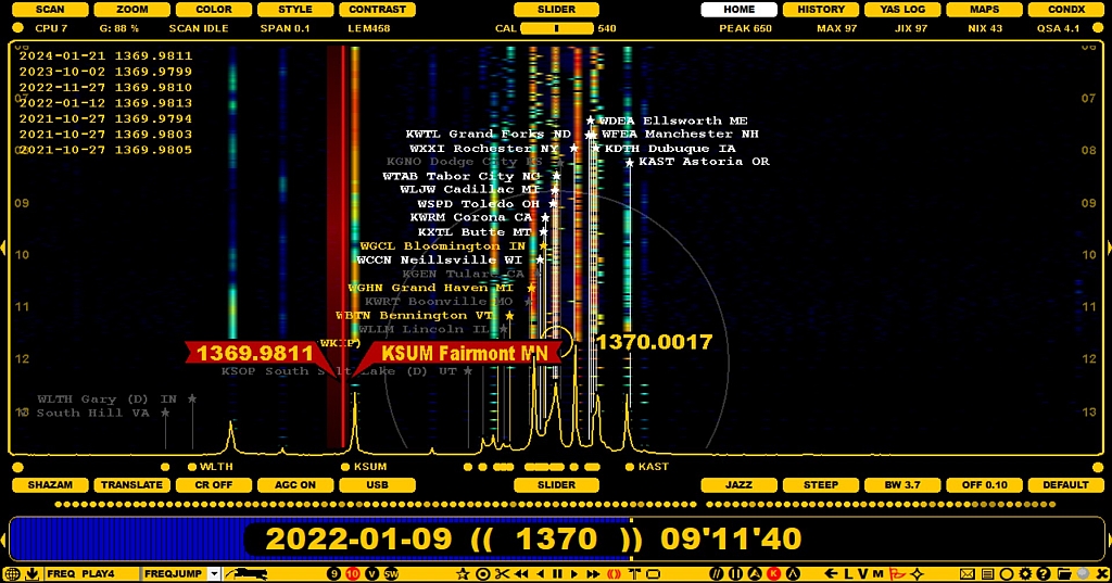 The FLAGS feature can be used to show the known offsets as vertical "flagpoles" on the SPECTRA displays. These flagpoles can be used on the displays to find matching spectrum tracks and thus help in the initial identification of the signal. However user should not trust too much on this feature: there are a lot of outdated or erroneous offsets listed so audio ID is still required for nailing the identity of any station. On the other hand FLAGS can offer a very useful tool for MW DXing.