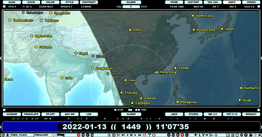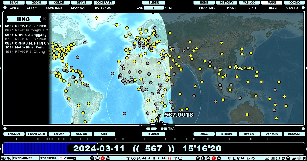 The FREQLIST function can be used to generate the frequency list for stations in the selected country or US state. In this example, the mouse cursor is hovered over Hong Kong, and the FREQLIST for the Hong Kong stations is shown on the left side of the display. If some country/US state contains more than one station on some frequency, only the country code (or US state code) is listed as the name.