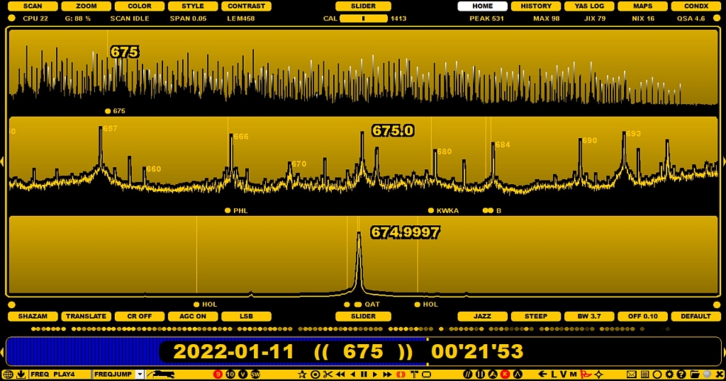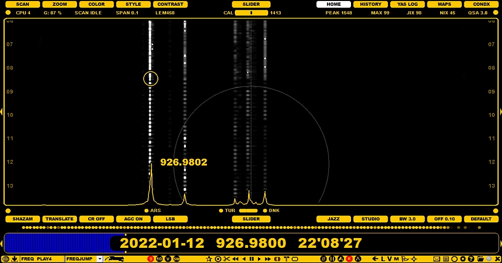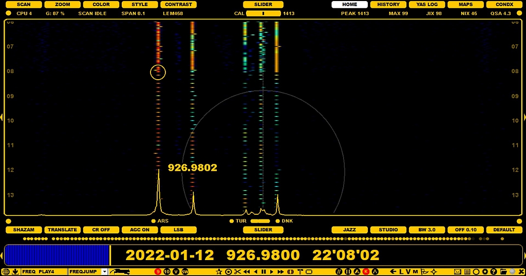 The HOME screen shows the spectrum of the currently-active frequency in the waterfall mode. The time span of the display covers the time period available in the recording. Note that, in the LIVE mode, there is always an active 10-minute playback buffer file (8 minutes if SAMPLING rate of 2000 is used). A small circle ("runspot") shows the location in the currently-playing file. You can left-click the mouse to jump into any time point / offset within that file.