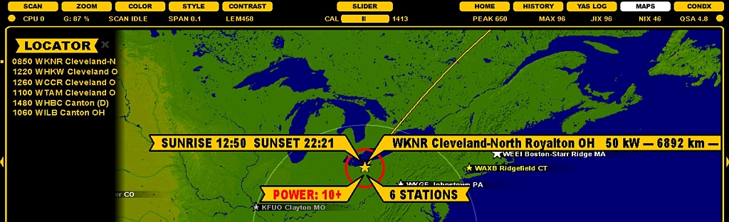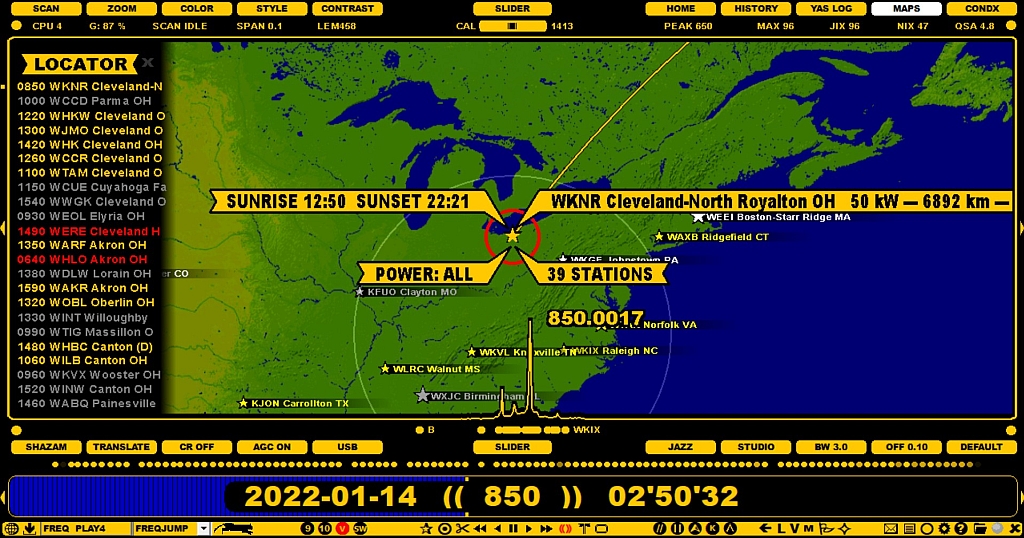 LOCATOR will zoom down on the map, showing the nearby area of the selected station. On the left column, you will see a list of the nearest stations within a 100-km radius by default, sorted by the distance to the selected station. You can increase/decrease the radius of the circle (stations to be included in the list), filter the stations on the list based on the transmitter power and you can also tune the stations on the list by scrolling/clicking.