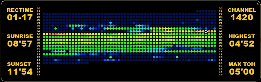 You can jump to any recorded HH:MM by clicking the ball. In addition, there are four predefined HH:MM times available for jumping: SUNRISE (the local sunrise HH:MM), SUNSET (the local sunset HH:MM), HIGHEST (HH:MM where the carrier strength is the highest on that day) and MAX TOH (HH:MM where the carrier strength is the highest among TOHs), just click the selected item.
