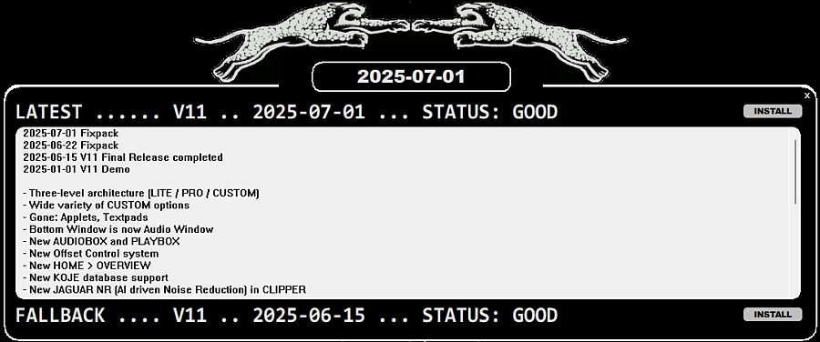 The VERSION window shows the latest news about JAGUAR's development and versions, for example