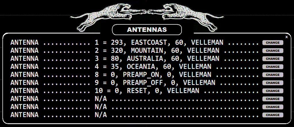 Let us assume that you have four beverage antennas, beamed at 293, 320, 80 and 35 degrees (with an estimated beam width of 60 degrees) and a preamp is also used. In the following example, the Velleman relay board is used: the slots 1-4 have the antennas and the slot 8 has the preamp. Each line is entered by clicking the "CHANGE" button, adding one antenna definition into the corresponding text box and then clicking "SAVE" for the added antenna).