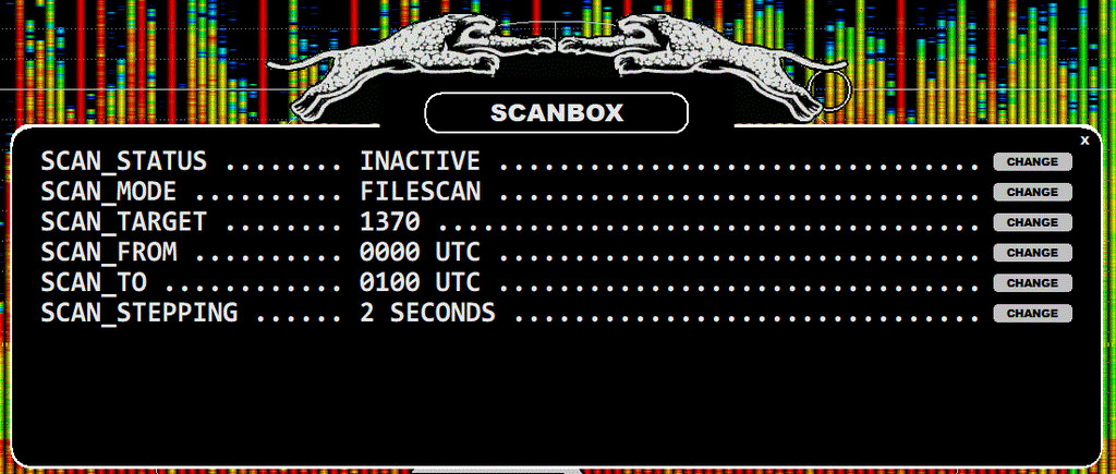 When the S button is clicked, you will see the SCANBOX panel where you can define the input parameters for FILESCAN (after selecting it as the SCAN_MODE; LIVESCAN must be disabled before FILESCAN can be selected as the new SCAN_MODE). When the parameters have been set, a FILESCAN run can be started by changing the SCAN_STATUS to ACTIVE.