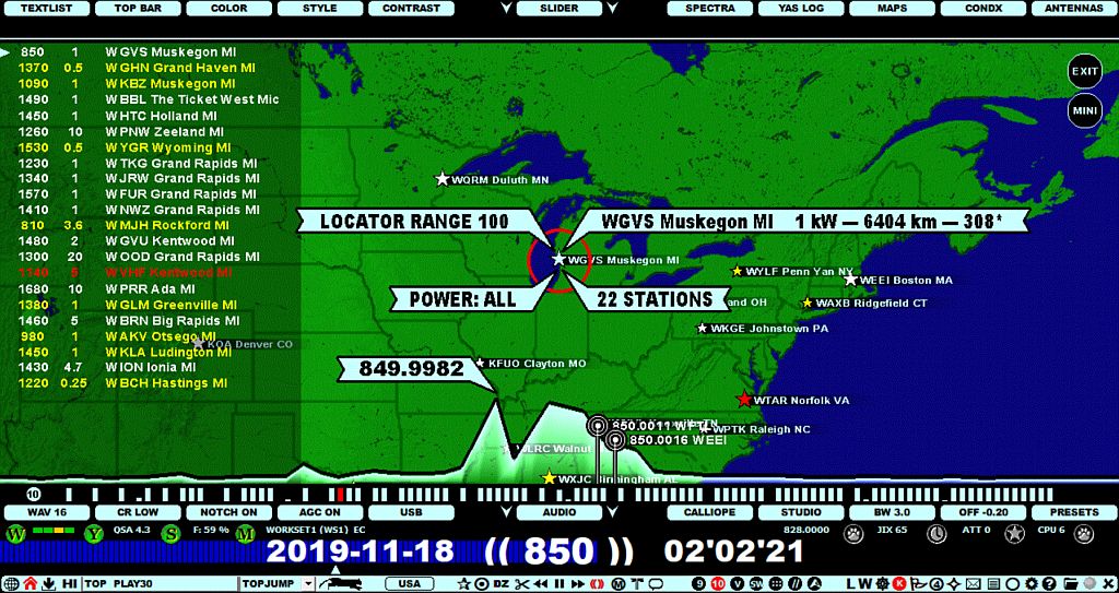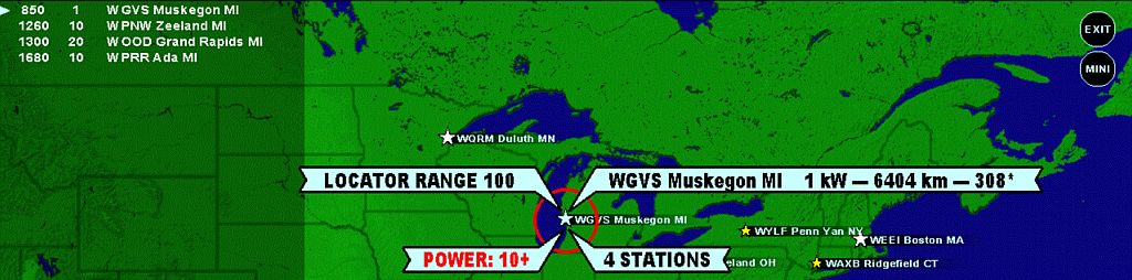 Clicking the MINI button (below the EXIT button) closes the LOCATOR window and displays a "mini map", small round MAPPLET window. Now when you scroll frequencies, MAPPLET will show the stations located on the selected area. You can relocate the position of MAPPLET on the display (by drag'n drop) and you can zoom it in and out by hovering the mouse over the window and scrolling the mouse scroll wheel or by using the left/right arrow keys. You can close MAPPLET by pressing ESC, or right-clicking on it.