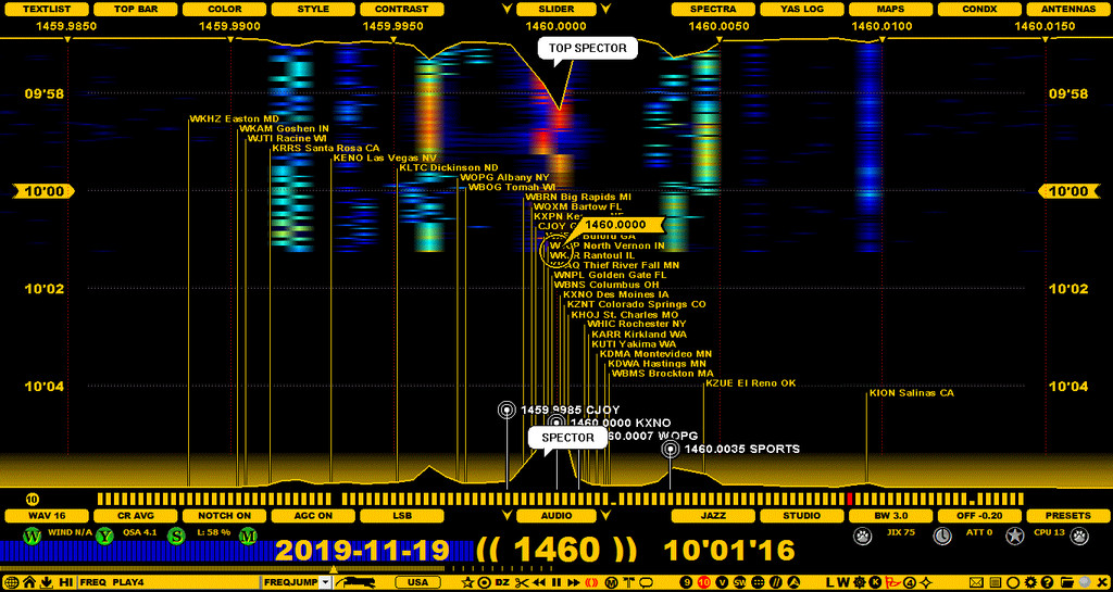 SPECTOR is the soul of JAGUAR, showing the signal strength on each exact frequency (offset). The SPECTOR display can look like a bunch of sharp needles or a "mountainous terrain", depending on the selected SPECTOR zoom level.