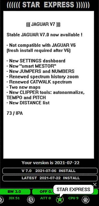 The STAR EXPRESS panel allows you to easily install the latest JAGUAR version (click on the lower XXXX-XX-XX INSTALL button) and also to revert back to the last-known stable release (click on the upper XXXX-XX-XX INSTALL button). The currently-used version is shown above those buttons ("Your version is XXXX-XX-XX").